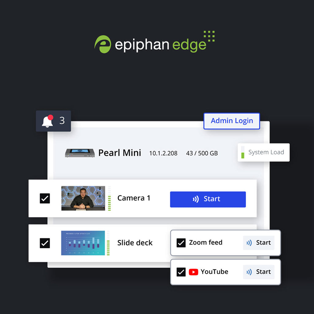 Inregistreaza, transmite si comuta pana la trei intrari video Full HD de la surse HDMI, SDI si USB cu Pearl Mini™ – sau beneficiezi de noul suport NDI|HX. Utilizeaza ecranul tactil generos sau interfata web intuitiva, ori acceseaza si controleaza sistemul de oriunde in lume prin Epiphan Edge.