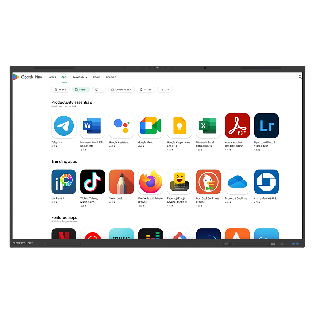 Magazinul de aplicații Cleverstore conține sute de aplicații concepute pentru clasa de elevi, iar fiecare dintre acestea au fost selectate și moderate de echipa de experți edtech ai Clevertouch. Sunt disponibile mai multe limbi și discipline, multe dintre acestea cu PDF-uri care pot fi descărcate pentru a fi utilizate împreună cu aplicațiile în timpul lecțiilor. Complet gratuit, fără reclame sau conținut nepotrivit, Cleverstore oferă conținut captivant pentru îmbunătățirea învățării.