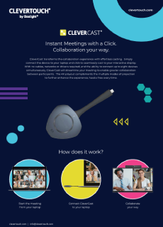 Partajeaza-ti prezentarile, documentele si ideile mai simplu ca oricand. Cu Clevertouch CleverCast, e suficient sa-l conectezi la ecranul Clevertouch din sala de sedinte pentru a-ti partaja continutul cu un singur click. Beneficiaza de un conector USB-C Plug and Play, conectare automata la retea, tehnologie Wi-Fi 6 de ultima generatie, partajare simultana de pe pana la 8 dispozitive, NFC integrat si ecranare Ultra HD.