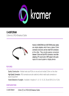 Seriile de cabluri A35M/2RAM și A35F/2RAM de la Kramer sunt adaptoare compacte și versatile, prevăzute cu un conector stereo de 3,5 mm la un capăt și doi conectori RCA la celălalt. Ele permit o conversie pasivă între conectorul de 3,5 mm și conectorii dubli RCA, fiind ideale pentru conectarea unei plăci de sunet de PC sau a unui player MP3 la intrările audio ale unui sistem audio sau ale unui dispozitiv de afișare.