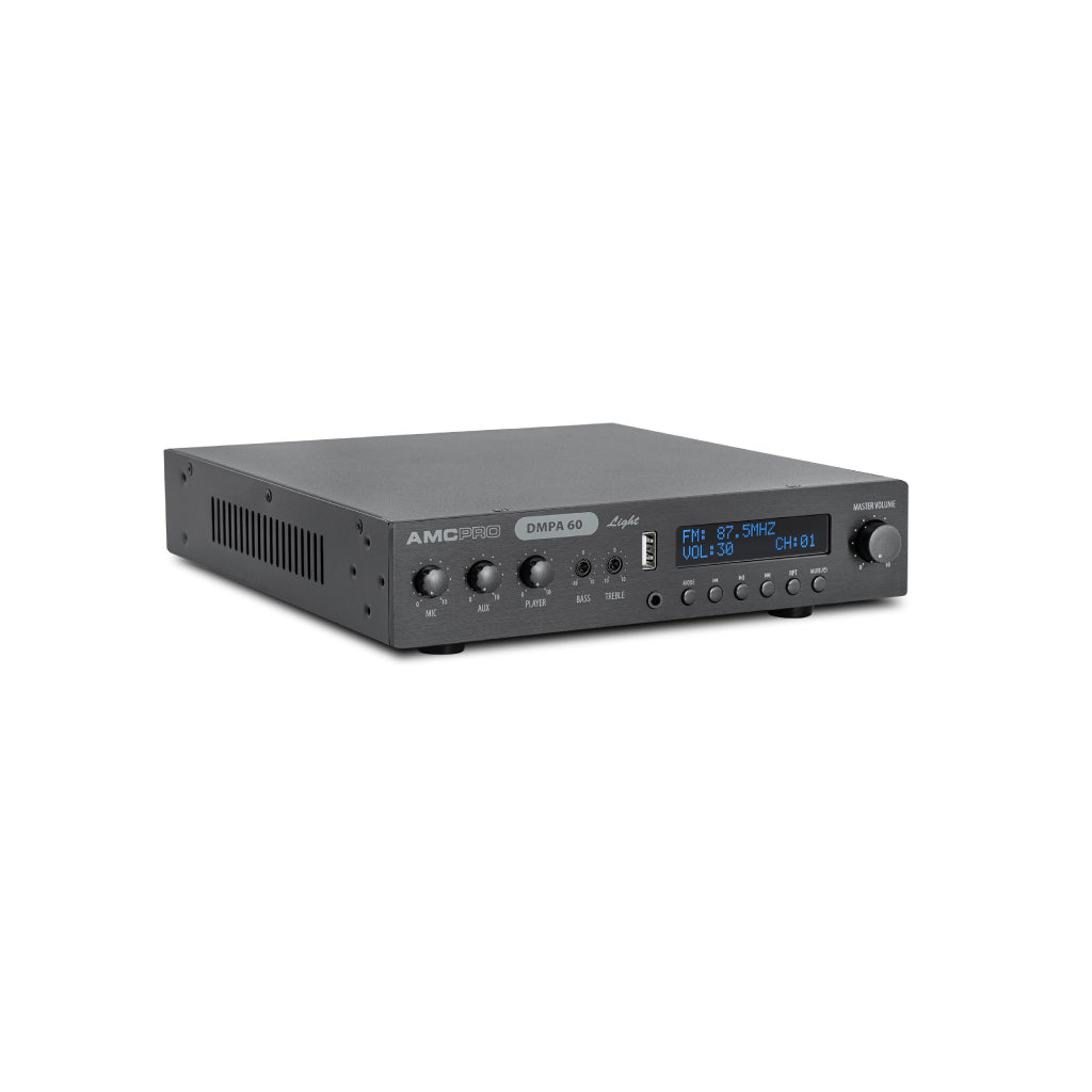 Seria DMPA Light dispune de amplificatoare audio clasa D cu sursă de alimentare comutată și transformator de ieșire 100V integrat. Fiecare unitate include intrare microfon prioritar cu phantom power, o intrare suplimentară de microfon, player media USB, intrare AUX, receptor radio FM, suportă streaming audio wireless de pe dispozitive mobile. Amplificatorul oferă funcție emergency mute și control de ton bass/treble pentru modelarea flexibilă a sunetului. Proiectate pentru instalare în spații compacte, unitățile au format 1U half-rack, fiind ideale pentru utilizare zilnică în spații publice mici și medii.