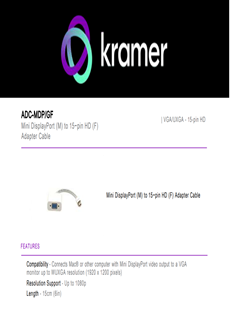 ADC‑MDP/GF este un adaptor de cablu Mini DisplayPort (M) către VGA cu 15 pini (F), lungime de 15cm, marca Kramer. Ideal pentru conectarea unui Mac® sau a oricărui alt computer cu ieșire video Mini DisplayPort la un monitor VGA, suportând o rezoluție de până la WUXGA (1920 x 1200 pixeli) pentru o calitate superioară a imaginii.