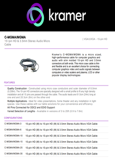 Cablul C‑MGMA/MGMA de la Kramer este o soluție de înaltă performanță, compactă și flexibilă, concepută pentru grafică computerizată și audio, având conectori HD cu 15 pini turnați și jack de 3,5 mm la ambele capete. Datorită structurii sale micro coaxiale subțiri, acest cablu este ideal pentru transmiterea simultană a semnalelor video și audio între computere, scalere video și display-uri de ultimă generație, precum ecrane cu plasmă, LCD și alte tehnologii moderne de afișare.