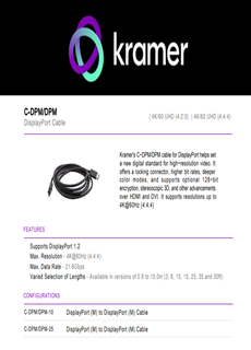 Cablul DisplayPort C‑DPM/DPM de la Kramer stabilește un nou standard digital pentru transmiterea video de înaltă rezoluție. Acesta dispune de un conector blocabil pentru o fixare sigură, rate de biți superioare, culori mai profunde și, opțional, criptare pe 128 de biți. În plus, suportă transmisii 3D stereoscopice și oferă multiple avantaje comparativ cu conectorii HDMI și DVI.