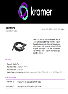 Cablul DisplayPort C‑DPM/DPM de la Kramer stabilește un nou standard digital pentru transmiterea video de înaltă rezoluție. Acesta dispune de un conector blocabil pentru o fixare sigură, rate de biți superioare, culori mai profunde și, opțional, criptare pe 128 de biți. În plus, suportă transmisii 3D stereoscopice și oferă multiple avantaje comparativ cu conectorii HDMI și DVI.