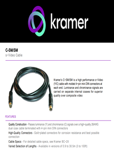 Cablu Kramer C‑SM/SM este un cablu s‑Video de înaltă calitate, proiectat pentru transmiterea separată a semnalelor de luminanță și crominanță, asigurând astfel o imagine superioară față de conexiunile video compozit. Conectorii solizi și materialele durabile îl transformă într-o soluție profesională pentru echipamente video analogice.