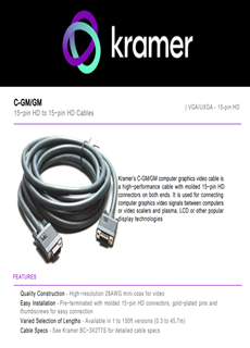 Cablul video grafic pentru calculator C−GM/GM de la Kramer este un cablu de înaltă performanță, ideal pentru aplicații de grafică computerizată ce necesită o calitate superioară a transmisiei video. Acesta este prevăzut cu conectori HD turnați, cu 15 pini la ambele capete, asigurând o conexiune fiabilă și durabilă. Cablul este utilizat pentru a transmite semnale video de înaltă calitate între computere, scalere video și diverse echipamente de afișare, cum ar fi ecranele cu plasmă, monitoarele LCD și alte tehnologii de afișare moderne.