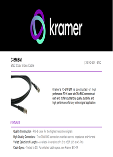 Kramer C‑BM/BM este realizat dintr-un cablu RG‑6 de înaltă performanță, echipat cu conectori BNC de 75Ω la ambele capete. Acest cablu asigură o calitate excepțională, durabilitate și performanță superioară pentru orice aplicație de semnal video.