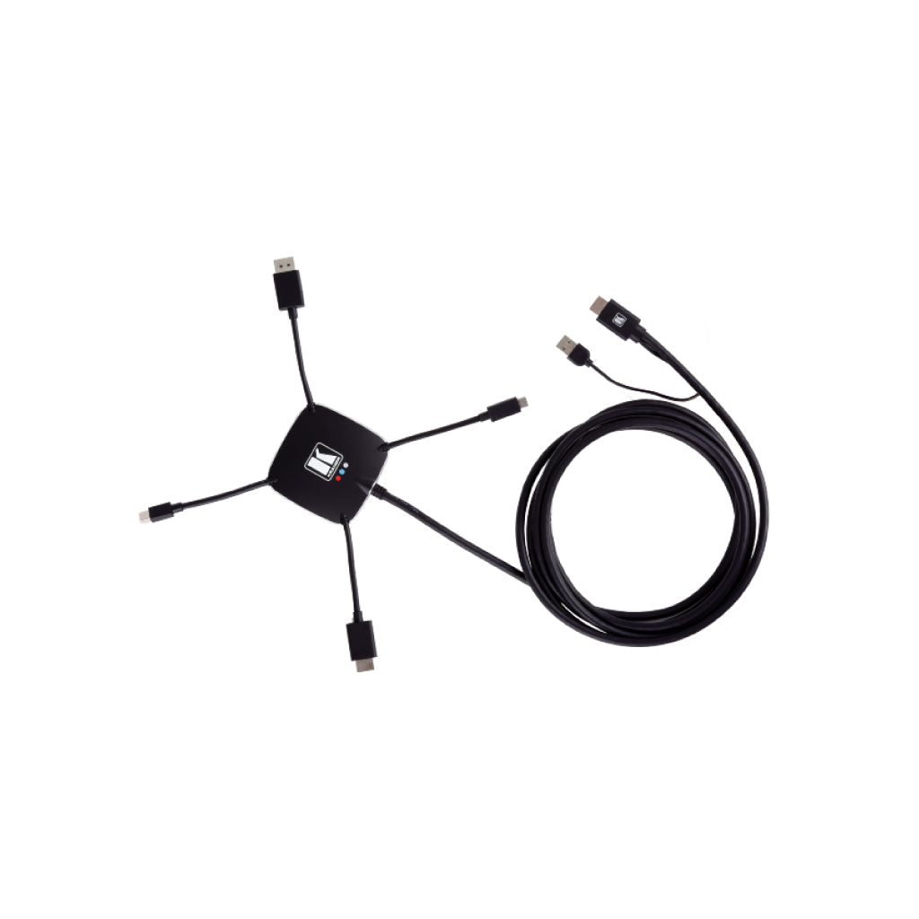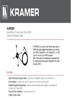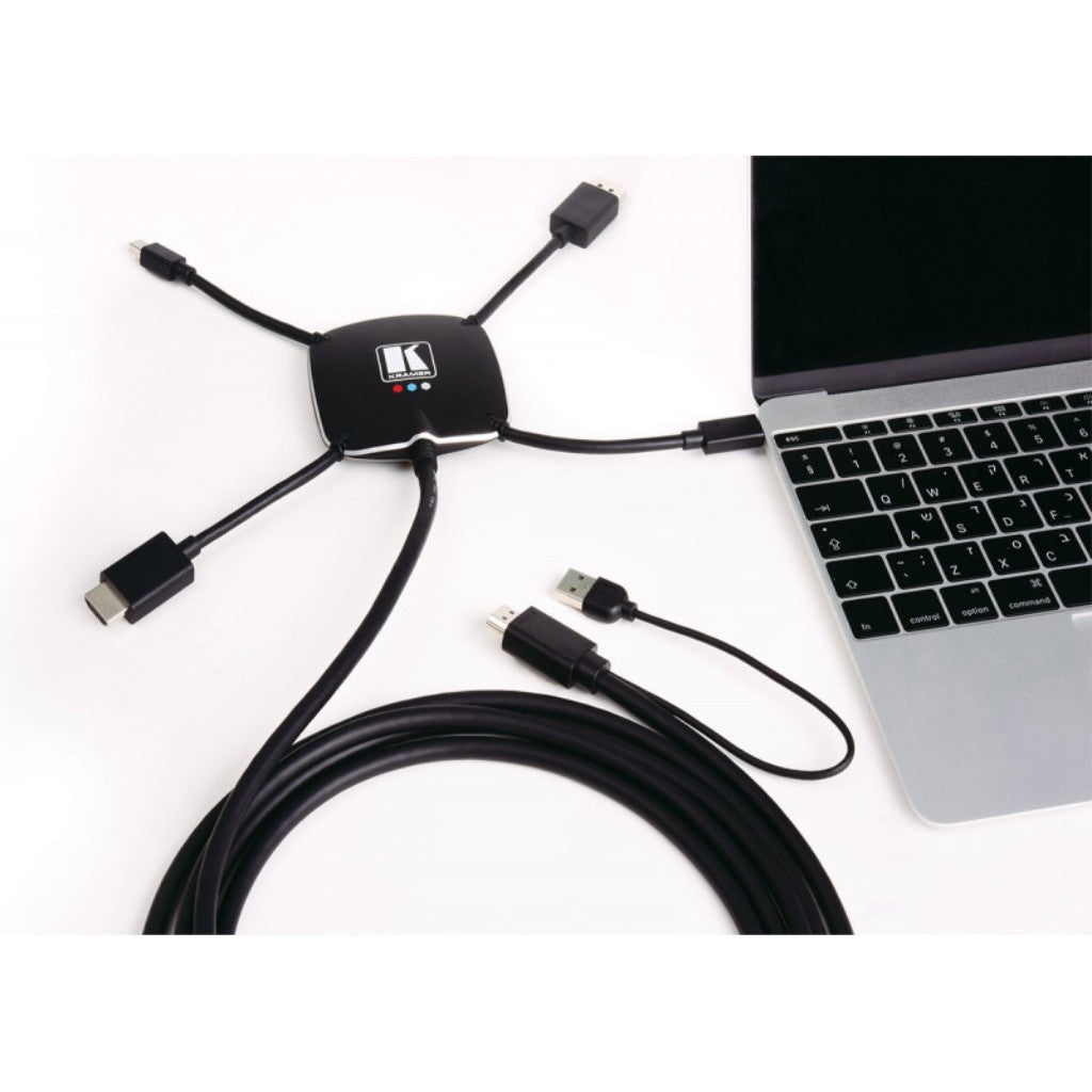 Kramer K-SPIDER este un adaptor activ de intrare male multiformat pentru ieșire male HDMI, care vă permite să conectați o sursă HDMI, DisplayPort, mini DisplayPort sau USB tip C la un acceptor HDMI.