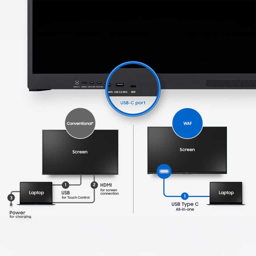 Conectivitatea este îmbunătățită cu portul USB-C 3-in-1, ce permite oglindirea ecranului, controlul tactil și încărcarea dispozitivelor externe (cu o putere maximă de 65W), facilitând profesorilor conectarea simplă la portul USB Type-C pentru a oferi lecții interactive și captivante, iar funcția HDMI Out permite partajarea conținutului ecranului tablei albe pe un ecran diferit și mai mare în sala de clasă, asigurând o experiență interactivă în timp real pentru elevi, indiferent de poziția lor în clasă.