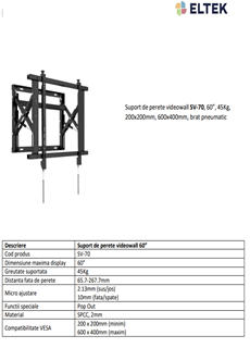 Suport profesional de perete pentru videowall ELTEK SV-70, 60”, 45kg, 200x200mm, 600x400mm, brat pneumatic